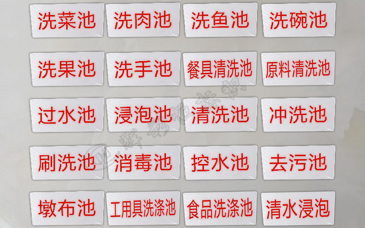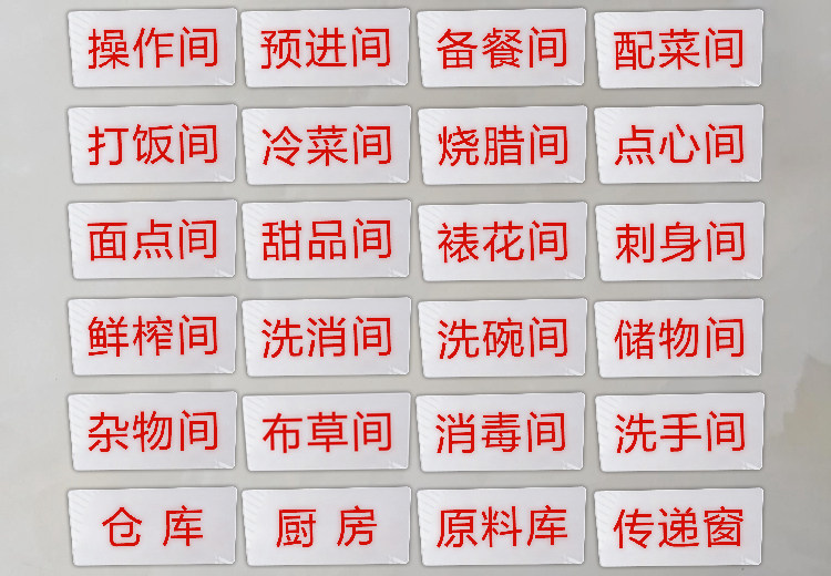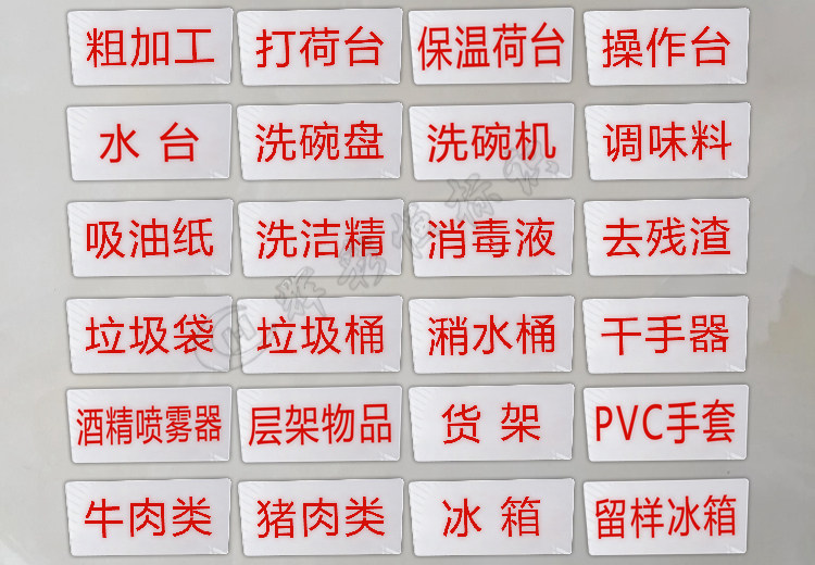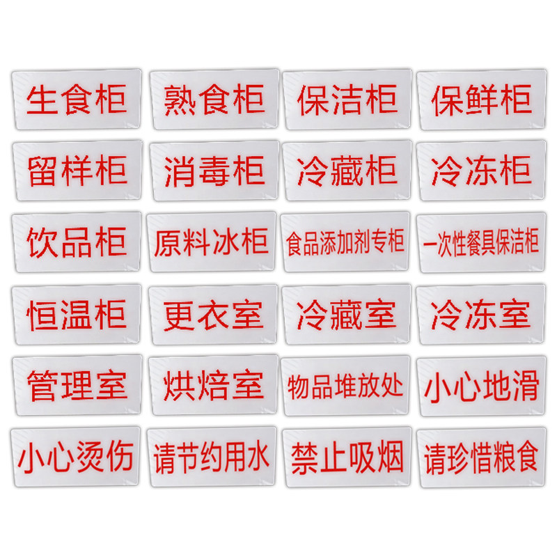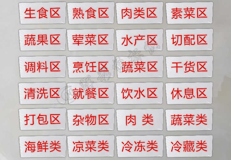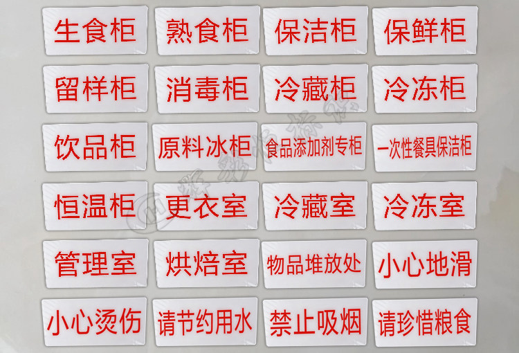生食柜 熟食柜 保洁柜 保鲜柜 留样柜 消毒柜 冷藏柜 冷冻柜 饮品柜 原料冰柜 食物添加剂专柜 一次性餐具保洁柜 恒温柜 更衣室 冷藏室 冷冻室 管理室 烘培室 物品堆放处 小心地滑 小心烫伤 请节约用水 禁止吸烟 请珍惜粮食 请选择