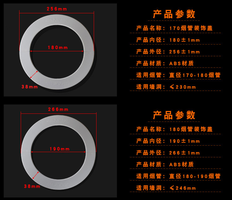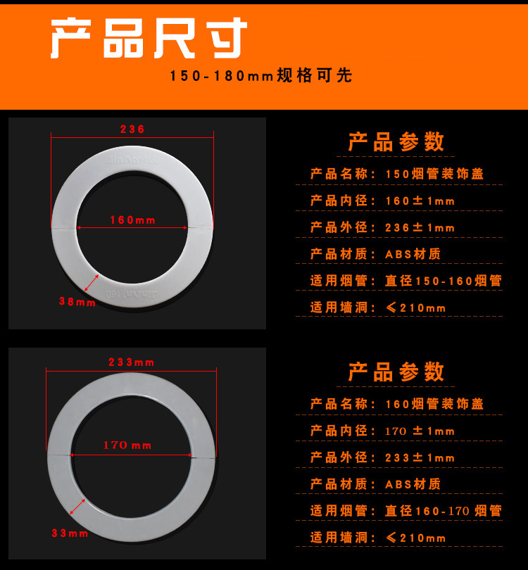 特别注意:如果管身与装饰盖接触的, 多大烟管选多大装饰盖就行。如果和油烟机接口部分接触需要大一号就行。