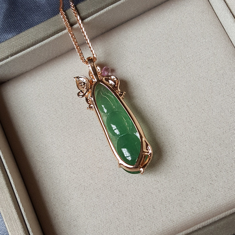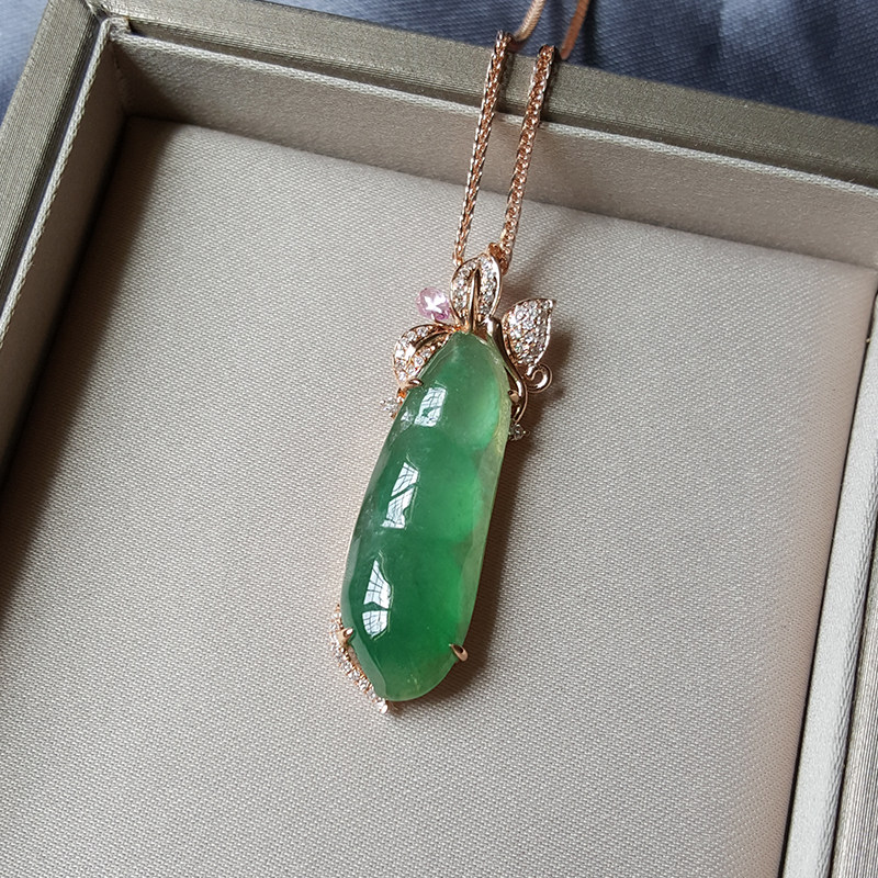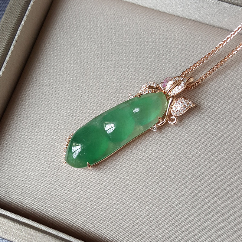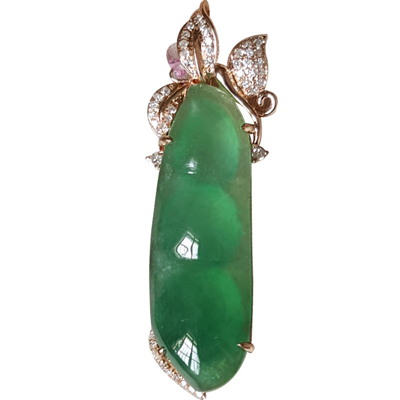 淘宝汉桑翡翠天然A货玉吊坠女 冰种阳绿福豆镶嵌18k金翡翠吊坠四季豆