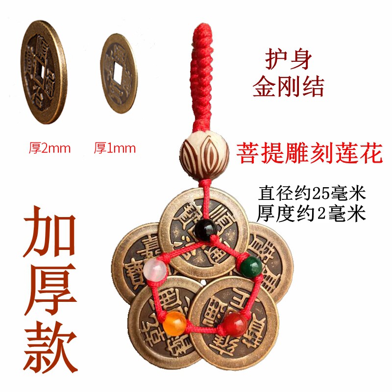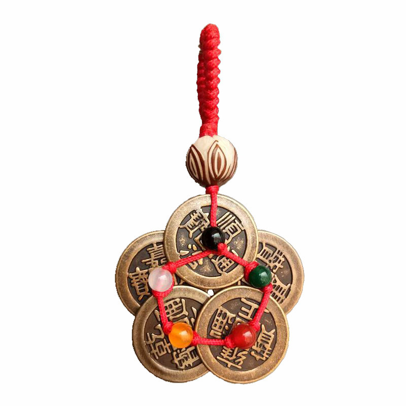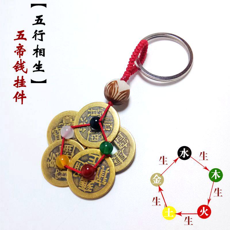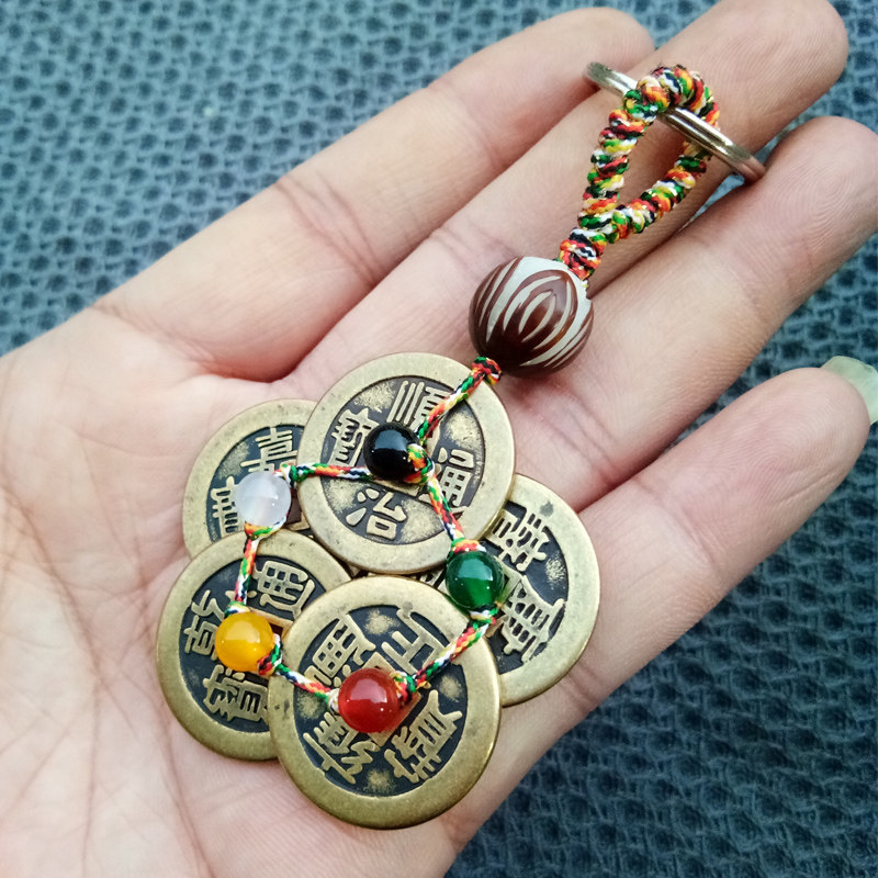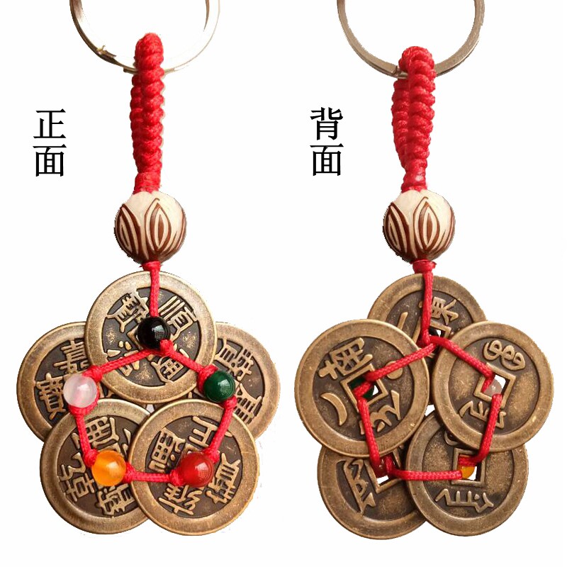 淘宝五帝铜钱串钥匙扣梅花五色珠挂件招财纯铜汽车风水吊创意饰品随身