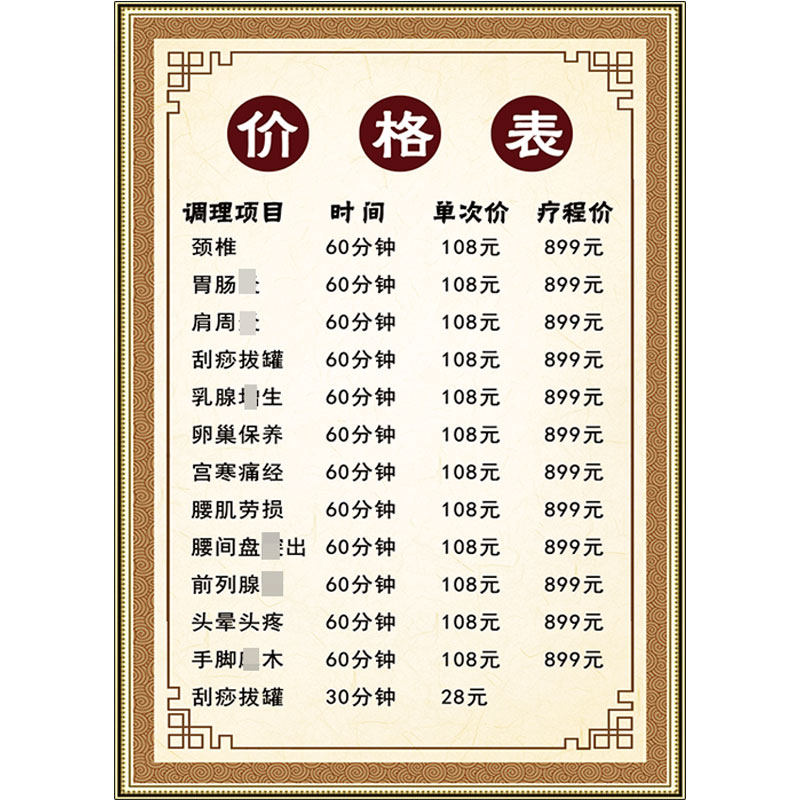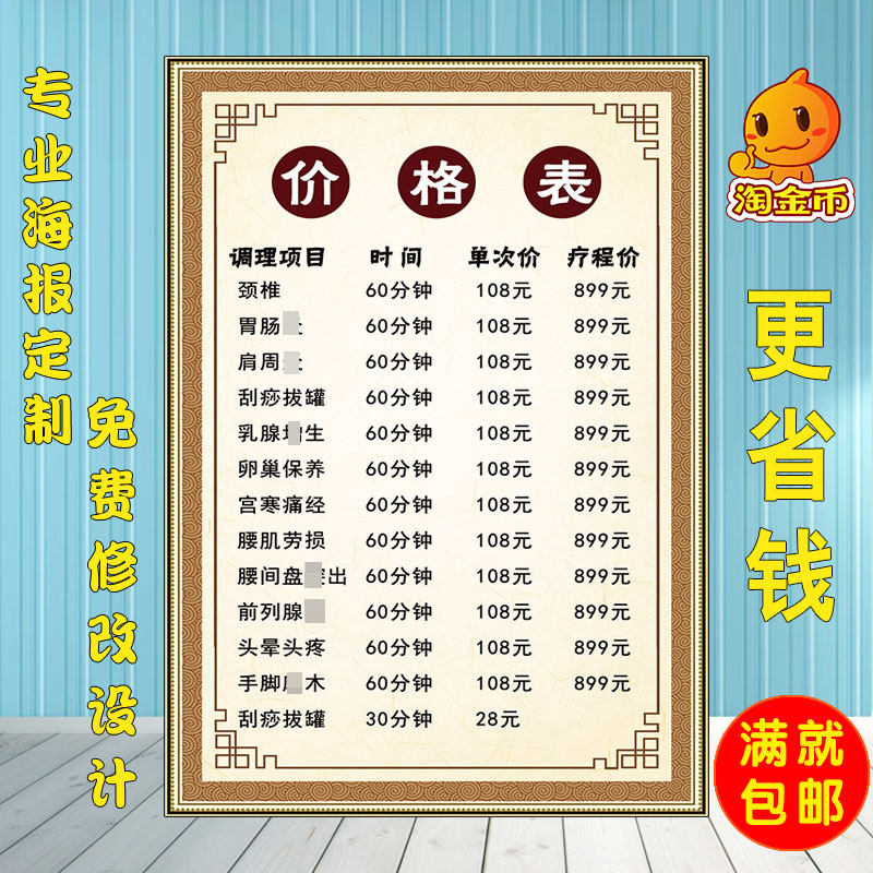 淘宝中医理疗养生美容院价格表价目表制作高档定制海报艾灸价目单定制