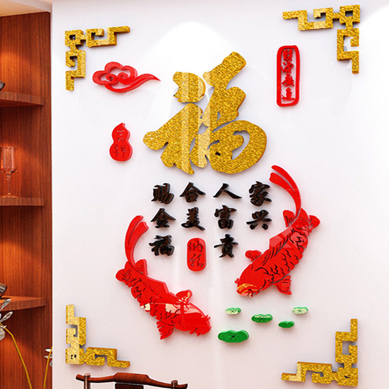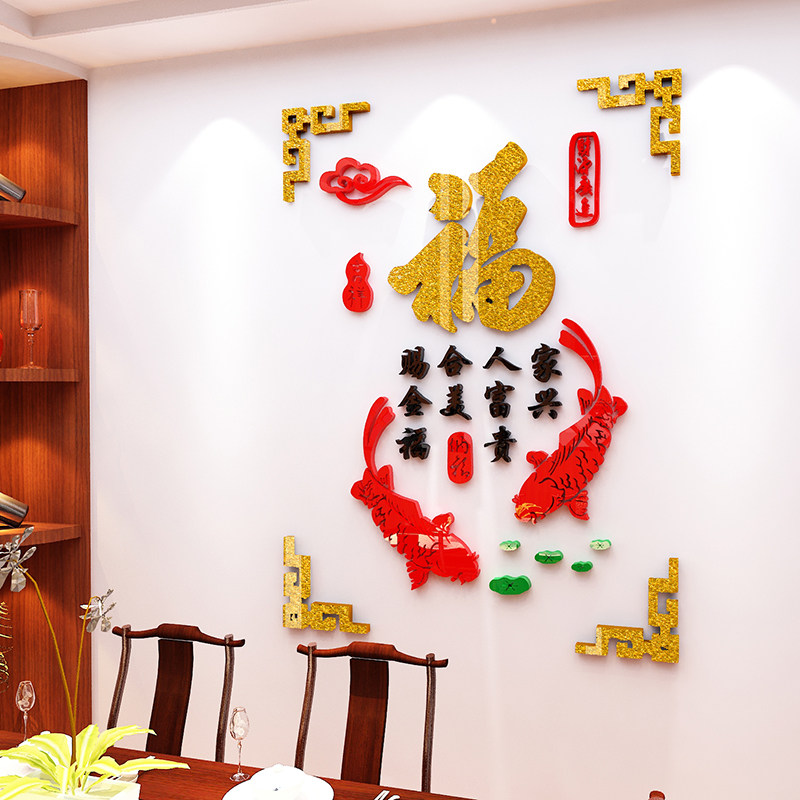 淘宝风水鱼餐厅墙面装饰中国风福字墙贴亚克力3d立体贴纸客厅玄关贴画