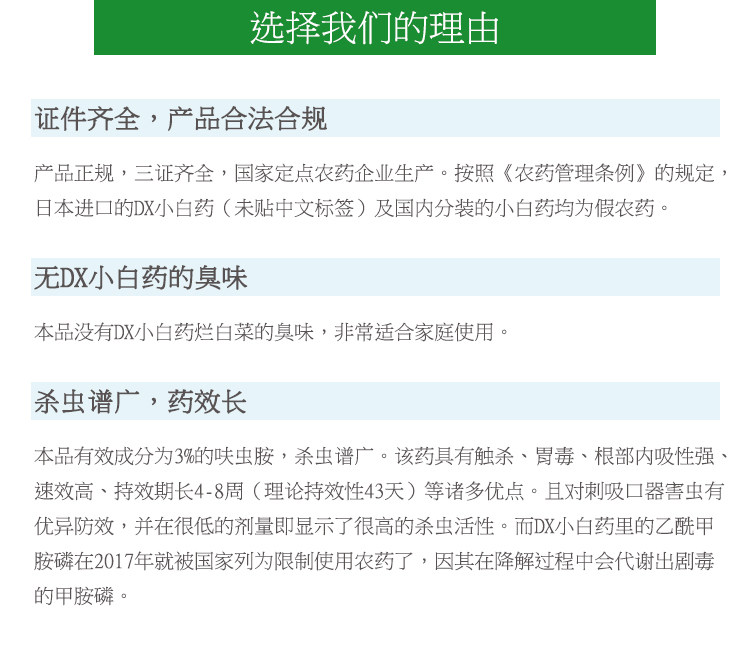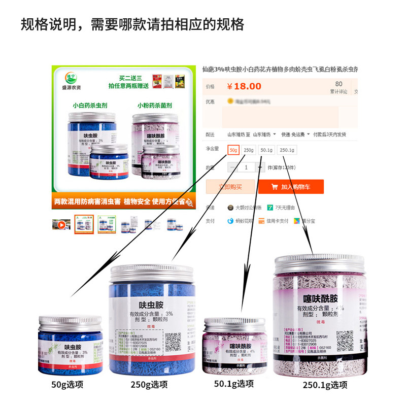 赠品说明:拍2瓶送哒螨灵10克一袋,吡虫啉8克一袋,生根粉40克一袋,由于赠品及利润有限,买多瓶也直送一套赠品,还望亲亲多多理解,谢谢!
