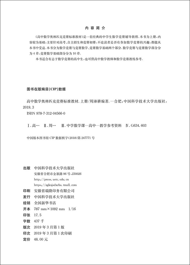 淘宝中科大 高中数学奥林匹克竞赛标准教材上册 周沛耕编著 中学奥林匹克奥数竞赛培优辅导教程数学竞赛经典题选自主招生竞赛教程